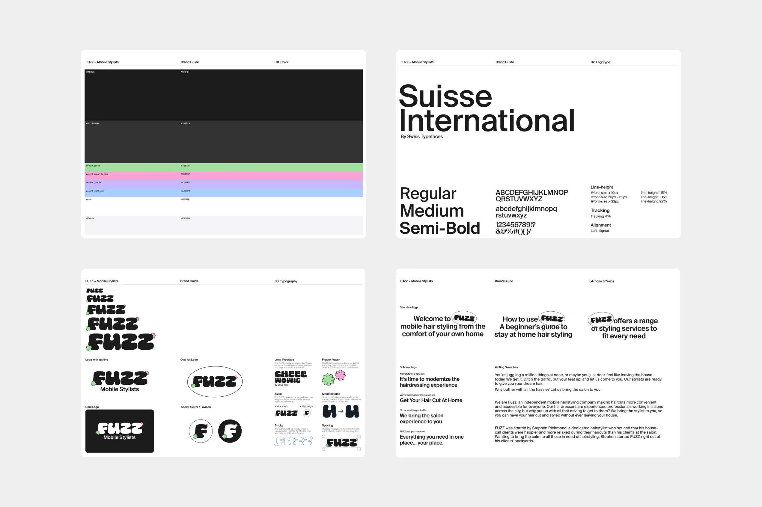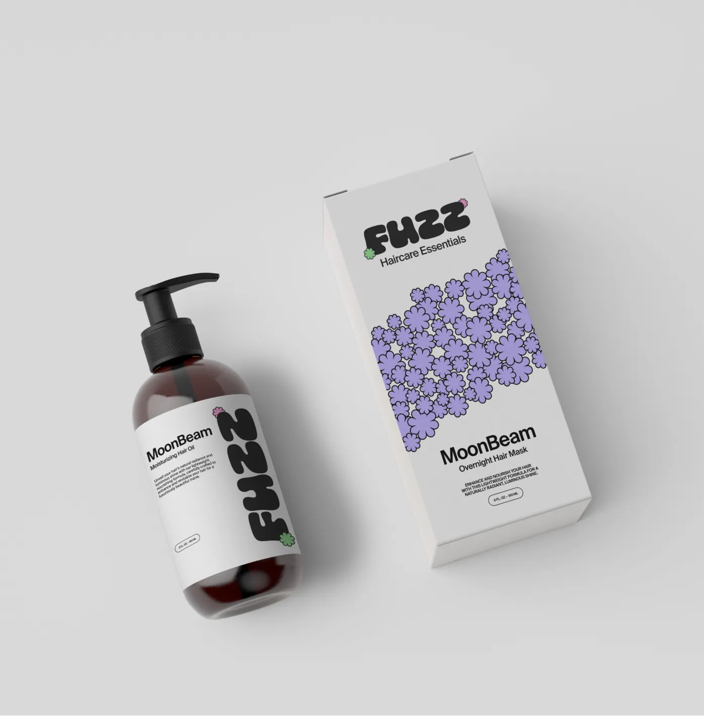FUZZ's roadmap includes the expansion into haircare product sales. In anticipation, we embarked on a creative exploration of the brand's visual system, extending the identity into the realm of cosmetic product and packaging design. Incorporating the 6-point flower, a recurring motif within FUZZ's brand system, we conveyed themes of growth and regeneration, evoking an image of transformation. The resulting series of mockups is designed to supplement a pitch deck and help envision a range of products that seamlessly integrate with the FUZZ brand.