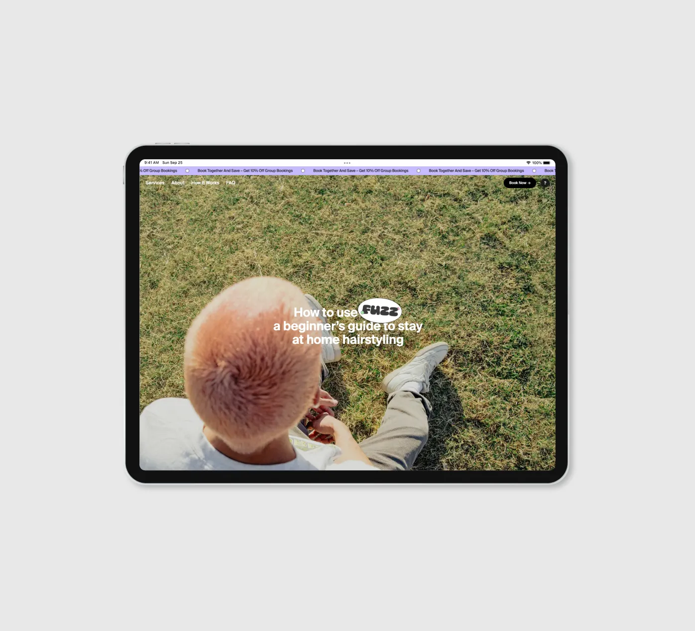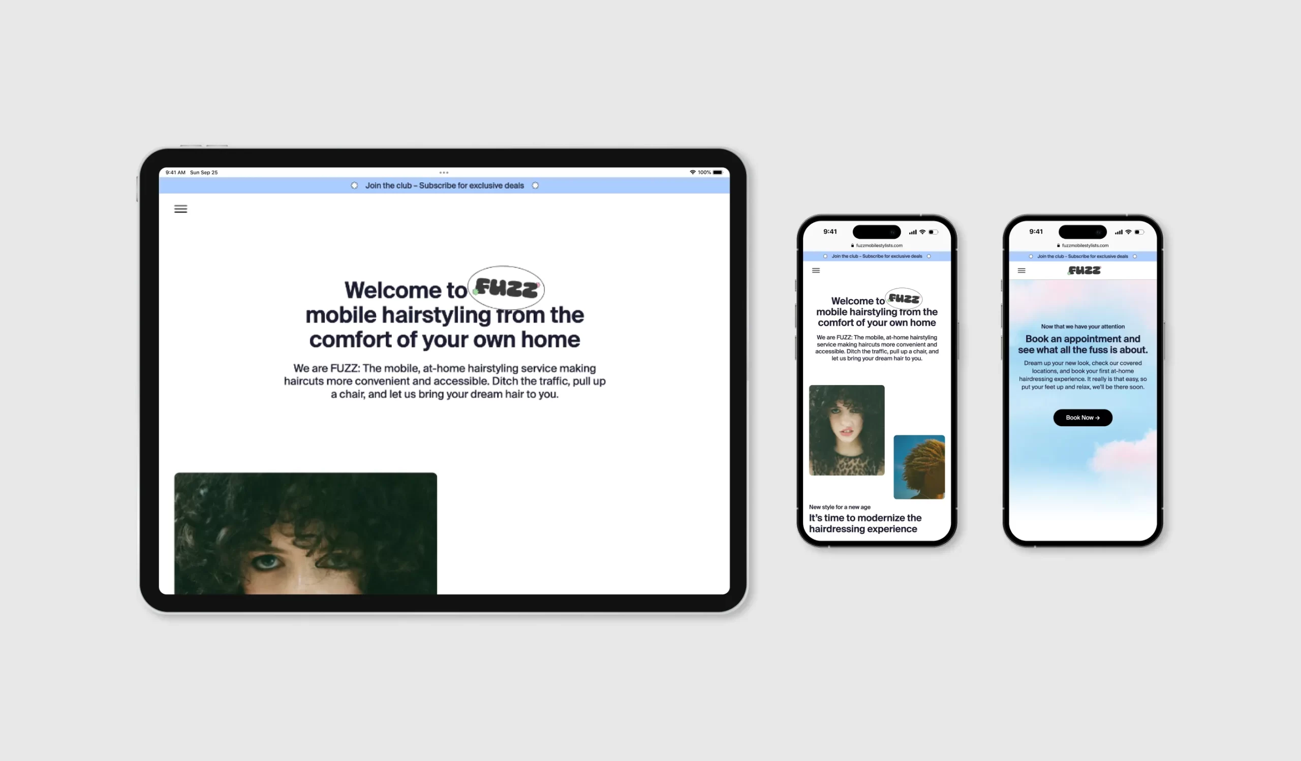 FUZZ offers a unique experience in the hair and beauty industry, enabling clients to book styling services in their homes as an on demand service. As such, the website is designed to communicate the brand’s narrative whilst demonstrating the concept of at-home hairstyling, which may be new to many clients.