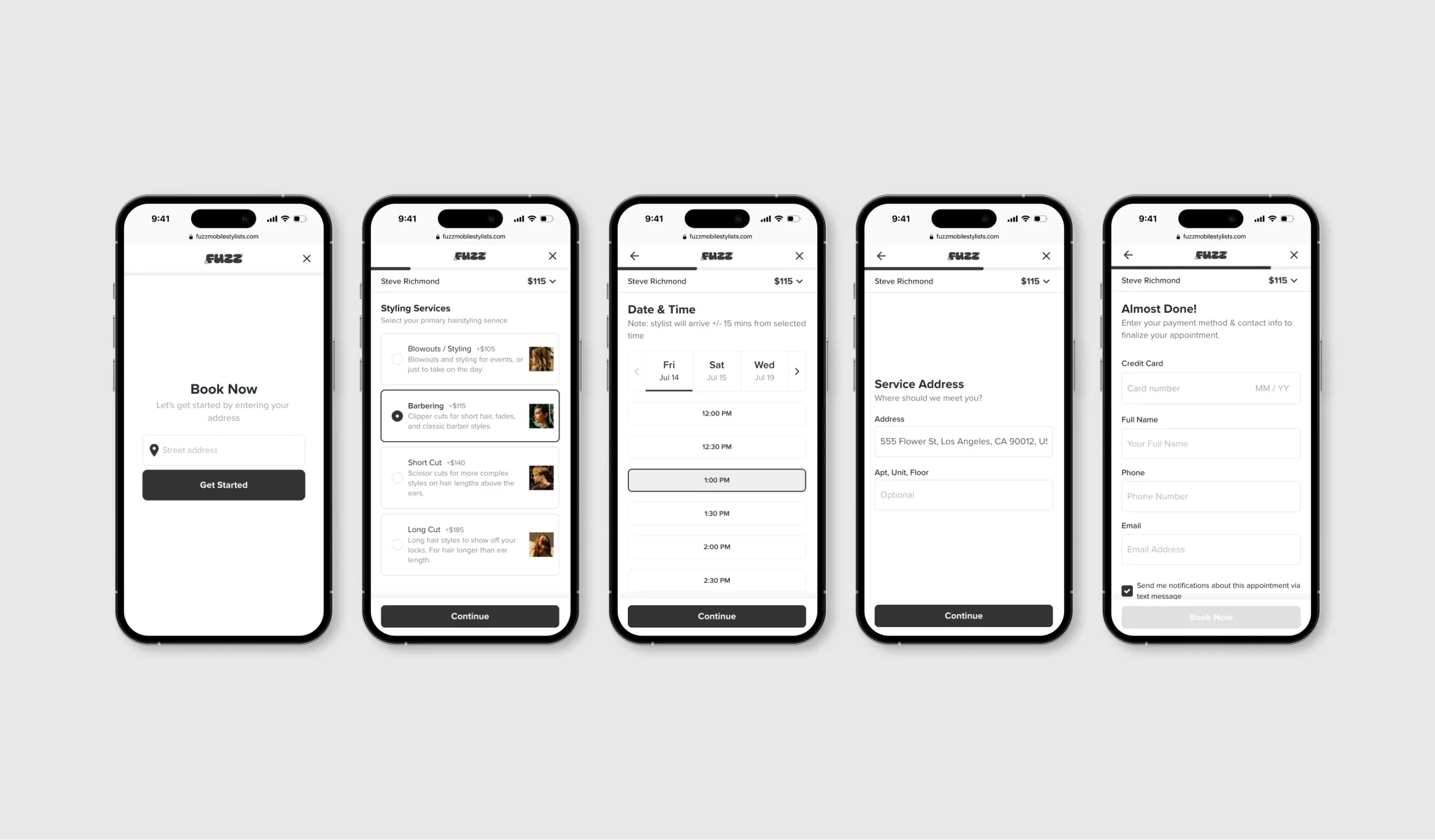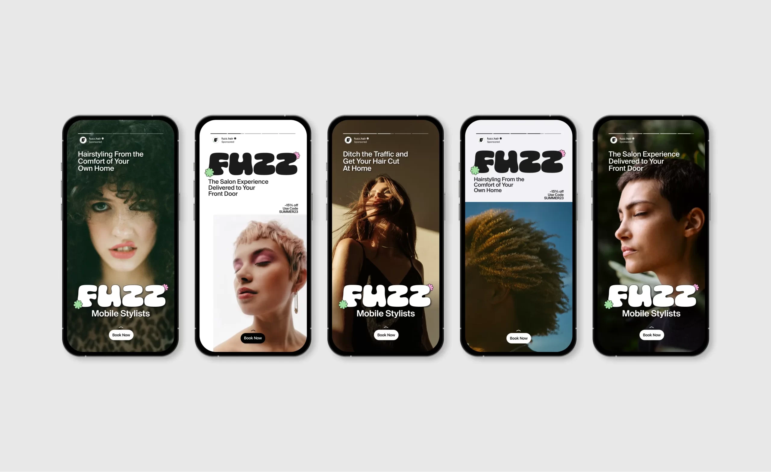 FUZZ Mobile stylists is a disruptor in the hair styling and beauty industry. Born in the wake of the Covid-19 pandemic, FUZZ began catering to clients weary of travel and crowded spaces. In the post-pandemic world of remote work and prioritizing self-care over unnecessary stress, FUZZ delivers high quality hairstyling services right to clients’ doors. This position is reflected in the brand’s care-free yet fashion-forward identity.